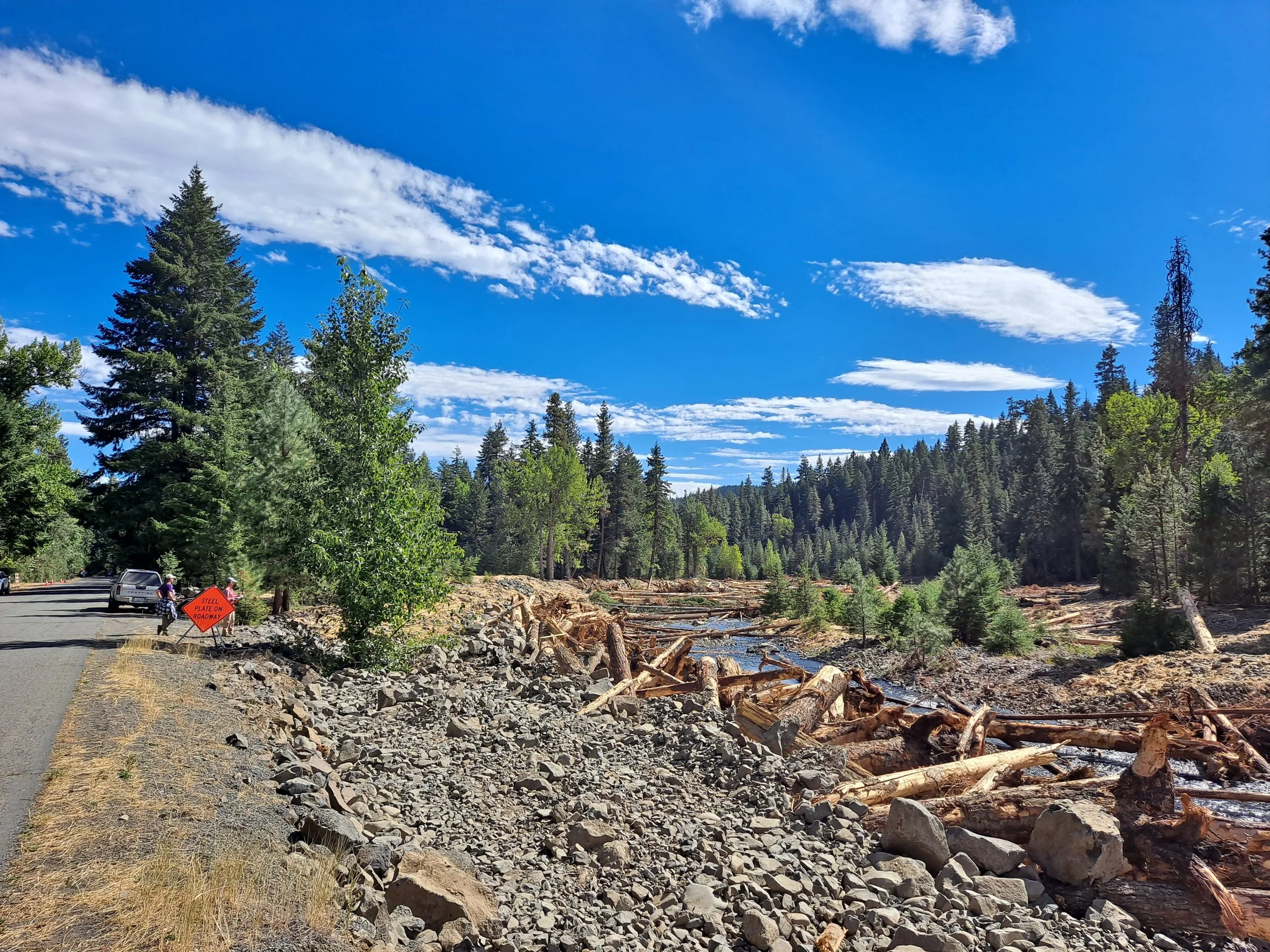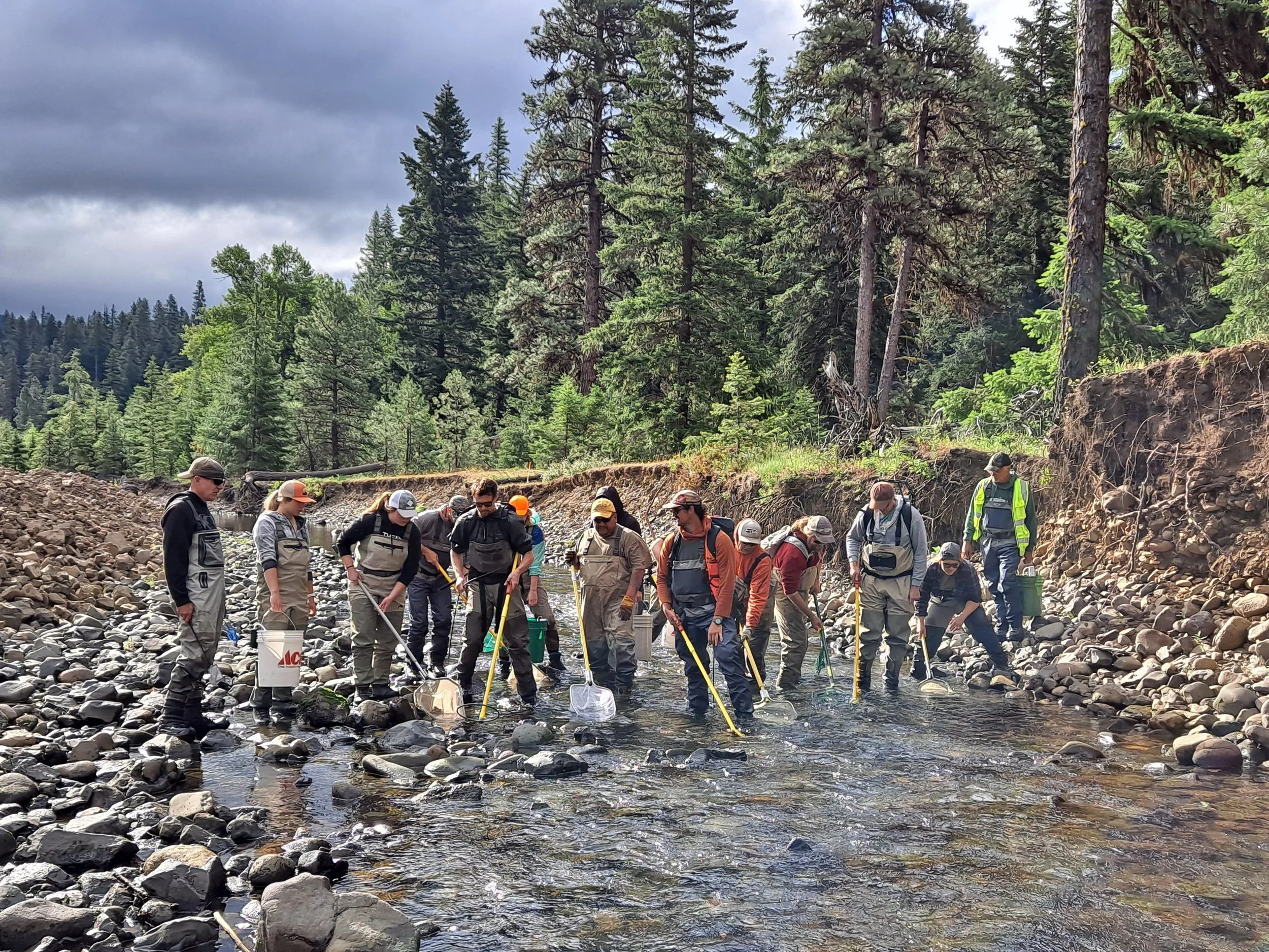 Construction took place in summer 2022, with BCI Contracting Inc. hired to remove two channel-confining levees, dismantle roughly 230 feet of rock armoring, regrade the channel with native material, reconnect two side channels, install 65 wood habitat structures, and place additional trees across the floodplain. The image (right) shows the downstream following levee removal and wood placement in September 2022. Trees (18–23" diameter) used for these structures and floodplain roughness were harvested adjacent to the site under a USFS thinning prescription—providing major cost savings and accelerating desired habitat conditions. Before dewatering began in July 2022, partners from multiple organizations assisted with fish removal (left) throughout the project area.